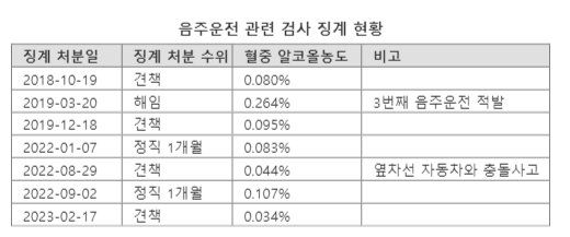 해당 사례를 비롯해 지난 5년간 음주 운전으로 징계를 받은 검사는 총 7명에 달한다. 이중 4명은 견책 처분을, 2명은 정직 1개월을 각각 처분받았으며 1명은 세 차례나 음주 운전으로 적발된 이례적 경우로 해임 처분됐다.