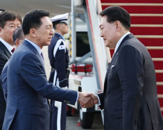 윤석열 대통령이 유엔총회 참석차 9월18일 미국 뉴욕으로 출국하기에 앞서 환송나온 김기현 국민의힘 대표와 인사하고 있다. 연합뉴스 |