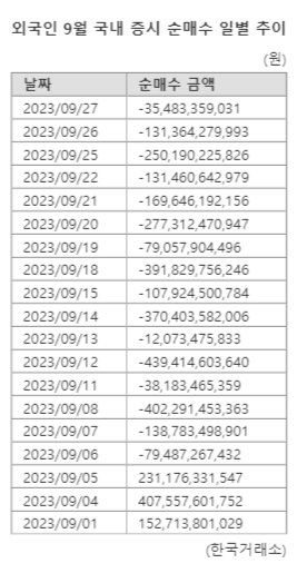 3일 한국거래소에 따르면 9월 외국인은 국내 증시에서 2조2826억원어치를 팔아치웠다. 지난달 6일부터 16거래일 연속 순매도 행진을 이어가고 있다. 유가증권(코스피)시장에서 1조652억원, 코스닥시장에서 1조2208억원의 순매도를 나타내고 있다.