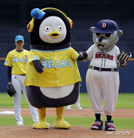 [서울=뉴시스] 최동준 기자 = 펭수가 3일 서울 잠실야구장에서 열린 두산 베어스 대 키움 히어로즈의 경기 전 시구 준비를 하고 있다. 2023.10.03. photocdj@newsis.com