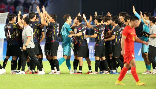 지난 1일 오후 중국 항저우 황룽 스포츠센터 스타디움에서 열린 제19회 항저우 아시안게임 대한민국과 중국의 축구 8강전에서 중국에 2대 0 승리를 거둔 대한민국 선수들이 기뻐하고 있다. 사진=뉴스1 |