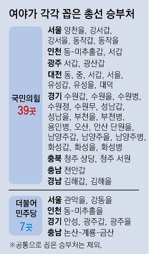 국민의힘은 이 16곳을 포함해 총 55곳을, 민주당은 최소 23곳을 핵심 승부처로 꼽았다. 국민의힘은 경기 지역에서 수원 지역구 5곳을 승부처로 정하고 ‘수원 과반 승리’를 목표로 하고 있다. 민주당은 경기 안성, 광주갑, 광주을과 인천 동-미추홀을 등 보수 표심이 상대적으로 강한 지역을 승부처로 삼아 수도권 우위를 굳히겠다는 전략이다.