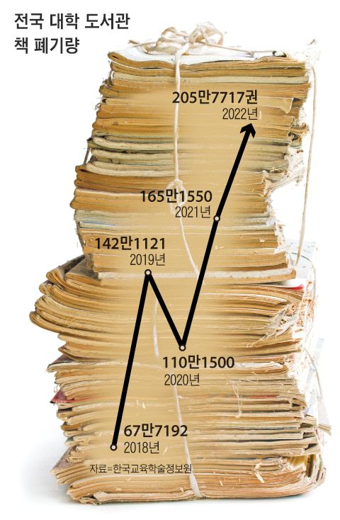 대학도서관의 ‘책 장례식’은 울산대만의 일은 아니다. 전국 대학도서관이 폐기한 책은 2020년 110만권에서 2021년 165만권, 2022년 206만권 등으로 매년 느는 추세다. 현행 도서관법은 연간 장서의 7% 이내로 폐기할 것을 권장하고 있다. 그러나 최근 3년간 장서의 7% 이상을 버린 대학은 7곳, 최근 5년간 서가 공간을 전시관·카페 등으로 바꾼 대학은 28곳이었다. 책을 치우고 캡슐 침대를 놓은 곳도 있다.