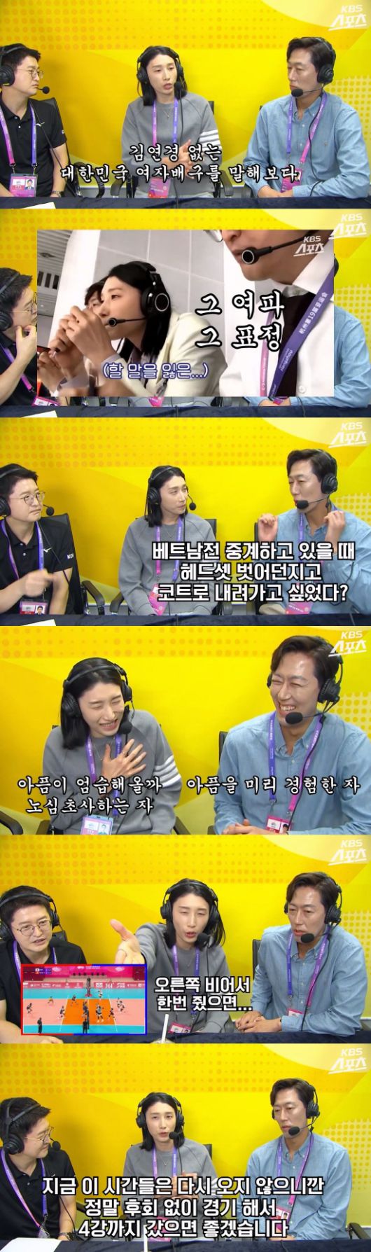 그리고 여자배구 조별리그 2차전이었던 베트남전 패배에 대한 이야기가 이어졌다. 당시 착잡한 표정으로 화제가 된 김연경 위원은 “선수일 때도 아쉬웠는데, 해설위원으로는 아쉬움이 더 커서 여파가 길었다”며 “네팔전 중계 하면서도 그 전날에 이렇게 이겼어야 했다는 아쉬움이 있더라”고 설명했다. 또 “내가 뛰었으면...? 여기까지만 하겠다”고 웃으며 말을 아끼기도 했다.
