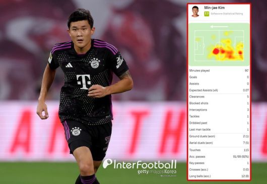 김민재는 저돌적인 수비, 안정적인 연계, 헌신적인 플레이를 선보였다. 수비 스텟은 클리어 5회, 슈팅 블록 1회, 인터셉트 3회, 태클 1회, 지상 경합 50%(2회 시도-1회 성공), 공중 경합 71%(7회 시도-5회 성공) 등이 있다. 발밑도 훌륭했다. 패스 성공 92%(99회 시도-91회 성공), 롱볼 성공 67%(12회 시도-8회 성공), 키패스 1회 등이 있다. 히트맵을 살펴보면 문전부터 하프라인까지 넓은 지역을 커버한 모습이다.