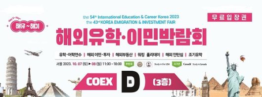 2023 가을 해외 유학·이민박람회는 10월 7일(토)~8일(일) 양일간 서울 코엑스 3층 D홀에서 개최된다. 행사는 모두 11시에서 18시까지 진행된다.