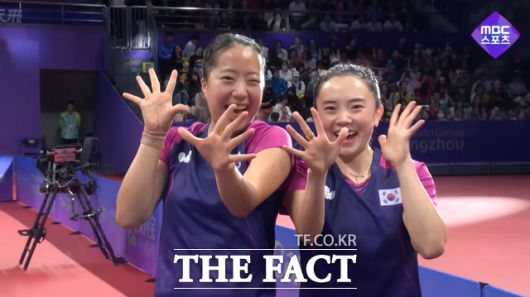 2일 중국 항저우 공슈 캐널 스포츠파크 체육관에서 열린 항저우 아시안게임 탁구 여자 복식 결승에서 신유빈(왼쪽)-전지희(오른쪽) 조가 우승한 후 세리머니를 하고 있다. /MBC 스포츠 캡쳐 |