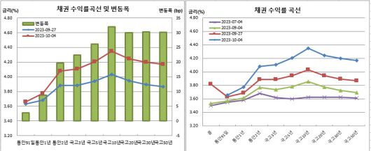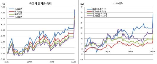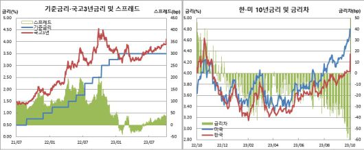 또 “국내 요인보다는 미국장이 근간이다. 미국장이 돌아서기 전에는 국내 채권시장도 쉽게 안정화되긴 어려워 보인다”며 “미국채 10년물 금리 5%가 얼마 남지 않은 상황이다. 상승폭이 막히지 않을까 기대하고는 있지만 미국채 수급이 악화돼 있는 상황이어서 시장 분위기 전환에는 상당한 시간이 필요할 것으로 예상된다”고 전망했다.