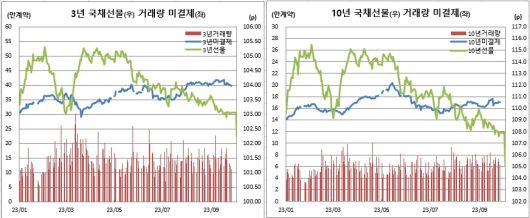 국채선물 장중 추이, 왼쪽은 3년 선물, 오른쪽은 10년 선물 |