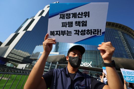 노동·시민·사회단체들로 구성된 공적연금강화국민운동(연금행동) 회원이 지난 9월1일 오전 국민연금 개혁방안 공청회가 열린 서울 강남구 코엑스 앞에서 재정계산위 규탄 기자회견에 참석해 피켓을 들고 있다. 연합뉴스 |