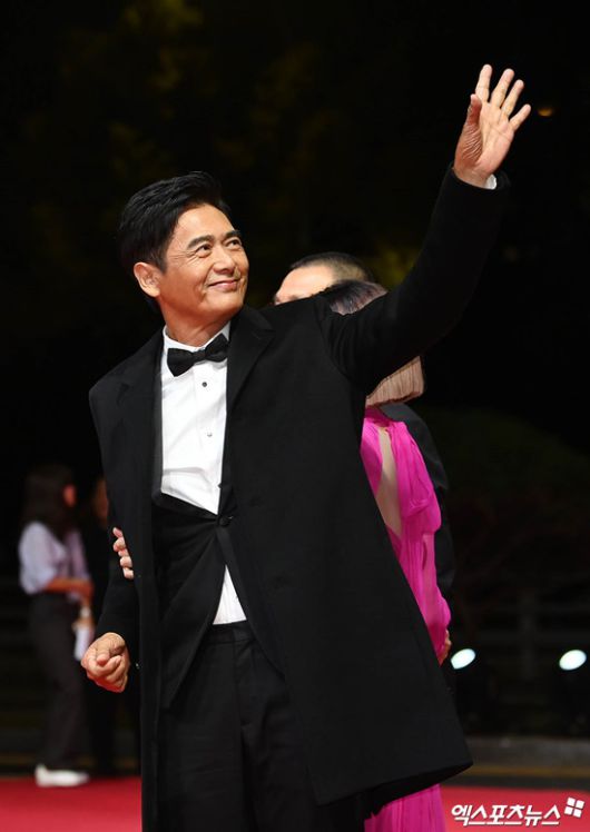 아내 진회련과 함께 레드카펫 위에 선 주윤발은 환한 웃음으로 멀리서 레드카펫을 바라보고 있는 관객들에게까지 손을 흔들어 인사를 건네는 여유를 보였다.