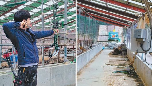 축사에 과녁 놓고 개인 연습 주재훈은 국가대표로 선발되기 전까지 마땅한 연습 장소가 없어 경북 울진군에 있는 지인의 한 빈 축사에 과녁을 세워 두고 시위를 당겼다. 청원경찰로 일하는 주재훈은 “근무하지 않을 때는 축사를 찾아 훈련했다. 야간 훈련을 위해 조명도 설치했다”고 말했다. 주재훈 선수 제공 |