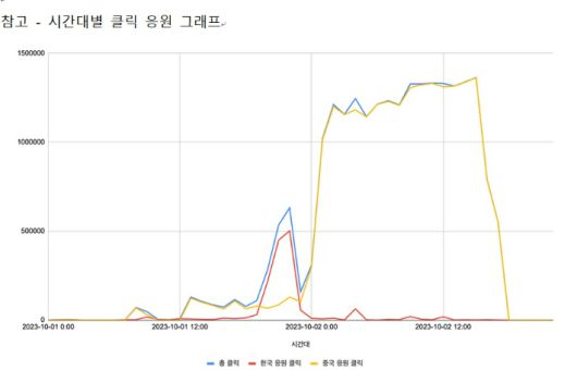 특히 이 해외 IP를 분석해보니 2개의 IP가 해외 IP 클릭의 99.8%인 1989만건을 차지했다. 2개 IP의 클릭 비중은 네덜란드 79.4%(1539만 건), 일본 20.6%(449만 건)이었다. 해당 IP의 클릭은 경기가 끝난 2일 0시 30분 경부터 이뤄진 것으로 분석됐다. 카카오는 한중 8강전 클릭 응원수의 이상 현상이 이용자가 적은 심야 시간 대 2개 IP가 매크로 프로그램을 활용해 만들어낸 이례적인 현상이라고 본다고 밝혔다. 이에 서비스 취지를 훼손한 중대한 업무방해 혐의로 간주하고 경찰에 수사를 의뢰한다는 방침이다.