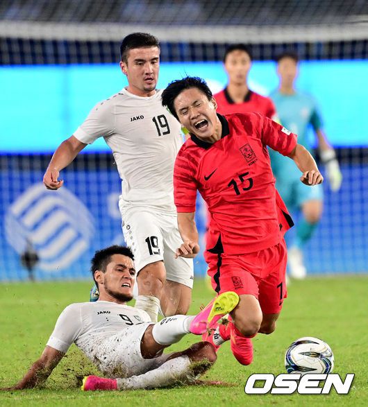 이 해설은 적중했다. 경기 초반부터 거친 몸싸움이 펼쳐졌다. 이강인, 조영욱 등 핵심 공격 자원들에게 우즈베키스탄은 거칠게 달려들었고 전반전 조영욱과 공중볼 싸움을 벌이는 도중에는 고의로 공중에 뜬 조영욱을 흘려버리면서 조영욱이 크게 그라운드에 떨어지기도 했다.