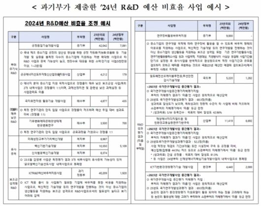 앞서 과기부는 내년도 R&D 예산을 대폭 삭감한 사유에 대해 '비효율' R&D를 조정한 것이라며 삭감 예시 12개 사업 목록을 국회에 제출한 바 있다.