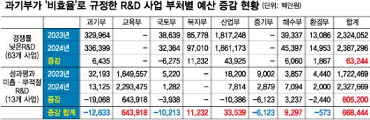 4일 국회 과학기술정보방송통신위원회 소속 이정문 더불어민주당 의원이 과학기술정보통신부·산업통상자원부·국토교통부 등 국가 R&D를 수행하는 부처 8곳의 2024년 예산안을 분석한 결과, 과기부가 '비효율'이라고 지목한 △경쟁률 낮은 R&D(632억원), △성과평가 미흡·부적절 R&D(6052억원) 예산은 오히려 전년보다 6684억원 증액됐다.
