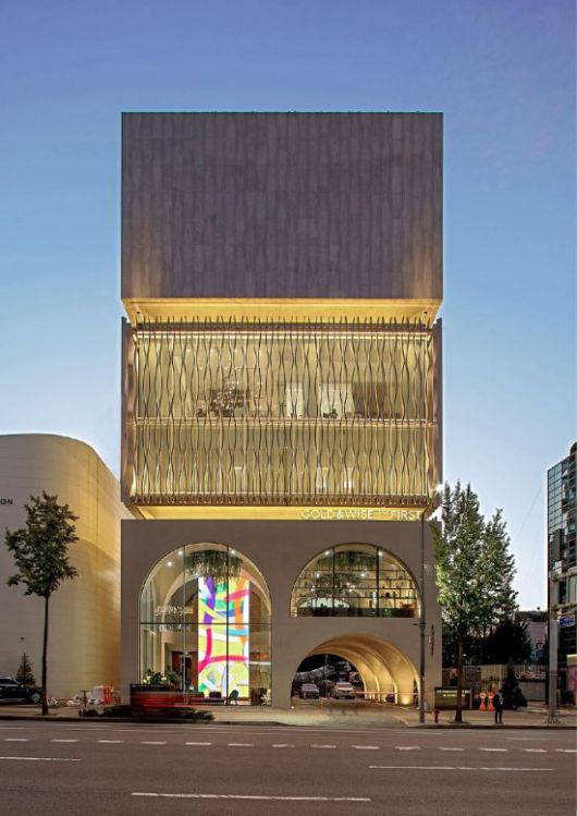 대상으로 선정된 건축물은 강남구 신사동에 있는 GOLD&WISE THE FIRST(사진·언주로 849)다. KB금융의 업무시설로 지하 2~지상 7층 규모, 연면적 3293.34㎡다. 아치 형태로 외부를 향해 부드럽게 열려있는 지상층, 곡선의 알루미늄 루버 사이로 햇빛이 들어오는 3~5층의 공간이 아름다운 건물이다.
