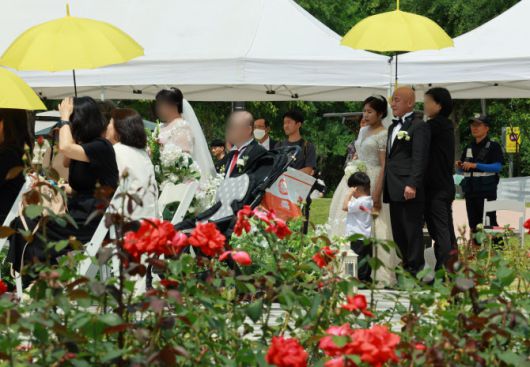 지난 6월11일 서울 강동구 광나루한강공원 장미원에서 부부 2쌍의 결혼식이 열리고 있다. (사진=연합뉴스) |