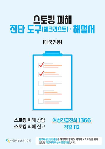 (서울=연합뉴스) 이상서 기자 = 여성가족부 산하기관인 한국여성인권진흥원은 스토킹 위험을 조기에 인지하고, 도움 요청 방법을 알려주는 '스토킹 피해 진단 도구(체크리스트)'를 온라인으로 제공한다고 5일 밝혔다.