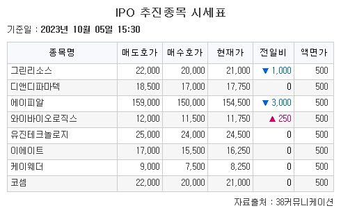 상장 예비심사 승인 종목으로 반도체와 디스플레이 코팅 소재 전문업체 그린리소스는 호가 2만1000원(-4.55%)으로 5주 최저가였다.
