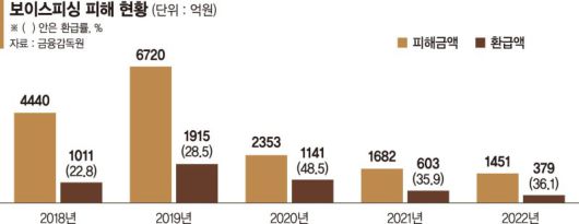 내년부터 보이스피싱으로 피해를 본 경우 소송절차를 거치지 않고도 피해금액의 최대 50%까지 배상받을 수 있게 됐다. 보이스피싱 수법이 날로 교묘해지는 가운데 고객 보호를 위해 은행이 가입한 '전자금융거래 배상책임보험'마저 유명무실하다는 지적에서다. 다만 이를 두고 은행권에서는 '책임이 과중하다' '통신업계도 대상에 포함시켜야 한다' 등 아우성이 나오고 있다.