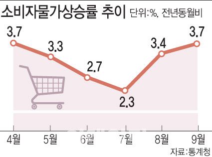 하지만 전문가들은 동절기 진입에 따른 국제원유가 상승 가능성, 미국 금리 인상가능성 등을 고려할 때 10~12월 물가가 현재와 비슷한 수준인 3% 후반대에서 유지될 가능성을 높게 봤다.