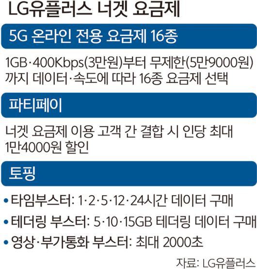 너겟 요금제 16종은 내년 3월 말까지 너겟 앱을 다운받은 뒤 가입할 수 있다. LG유플러스는 다음달 1일 최대 11GB의 데이터를 추가로 제공하는 만 19∼29세 전용 너겟요금제도 추가로 선보일 예정이다.
