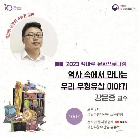 [이데일리 이윤정 기자] 문화재청 국립무형유산원은 오는 12일 전북 전주시 국립무형유산원 소공연장에서 ‘책마루 문화프로그램 인문학 강연’을 진행한다. 강문종 제주대 교수와 함께 ‘역사 속에서 만나는 우리 무형유산 이야기’를 주제로 이야기를 나눠본다.
