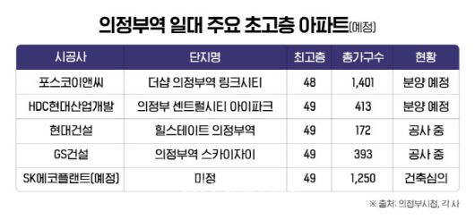 6일 분양업계에 따르면 의정부역 인근(반경 500~600m)에 의정부시 최고층 높이로 현재 공사 중이거나 사업을 앞둔 현장들은 5곳가량으로 최고 48~49층 규모다. 현재 의정부 지역 최고층(30층 안팎)과 비교하면 최대 10층 이상 높은 수준이다.