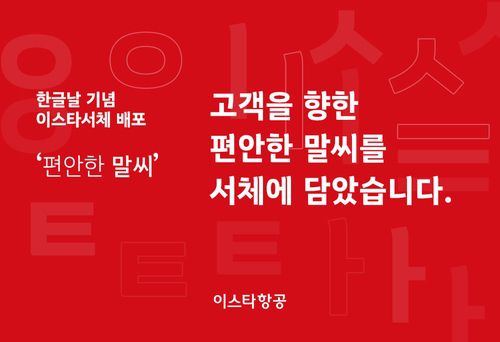 ▲ 이스타항공은 제577회 한글날을 기념해 전용 서체인 '이스타서체'를 홈페이지에서 무료로 배포한다고 6일 밝혔다. 고딕 형태의 서체 기둥에 꺾임과 곡선을 더해 '고객을 생각하는 친절하고 편안한 말씨'를 표현했다고 이스타항공은 설명했다. 개인과 기업 모두 상업적 용도로 사용할 수 있지만, 서체를 유료 판매하거나 변형·왜곡해서는 안 된다. (서울=연합뉴스)