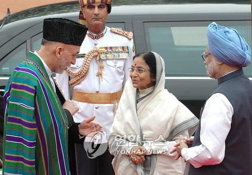 담소하는 카르자이 전 아프간 대통령과 파틸 전 인도 대통령 |