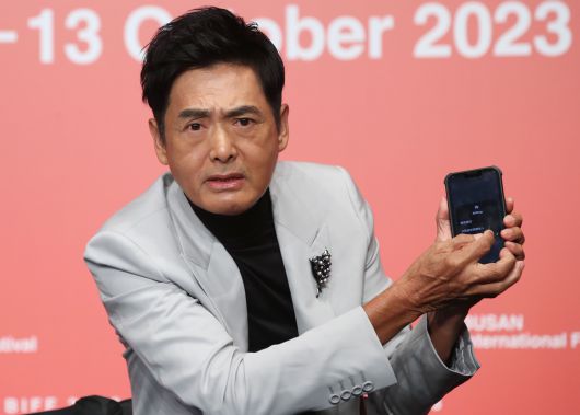홍콩 배우 주윤발(저우룬파)이 5일 부산 해운대구 KNN시어터에서 열린 제28회 부산국제영화제(BIFF) 올해의 아시아영화인상 기자회견에서 셀카를 찍은 뒤 사진 공유 방법을 알려주고 있다. /뉴스1 |