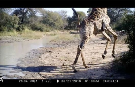 남아프리카 그레이터크루거 국립공원에 설치된 장비에서 사람의 목소리가 들리자 도망가는 기린의 모습. Current Biology 캡처 |