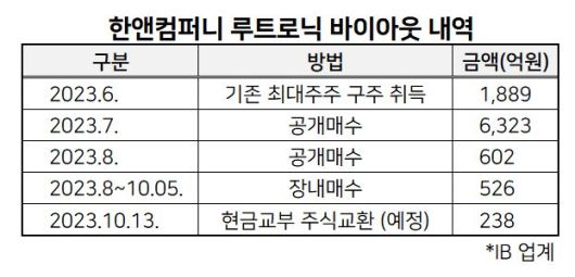 한앤컴퍼니는 루트로닉 잔여 지분에 대해서는 주식교환을 통해 소유하게 된다. 루트로닉은 한앤코23호와 주식교환 작업을 진행 중이다. 현금교부형 주식교환으로 다른 주주가 소유한 루트로닉 주식도 모두 한앤코23호에 이전될 예정이다. 이 과정에서 기존 주주에게 보통주는 주당 현금 3만6700원, 전환우선주는 5만5258원을 지급한다. 여기에 마지막으로 약 238억원을 투입한다.