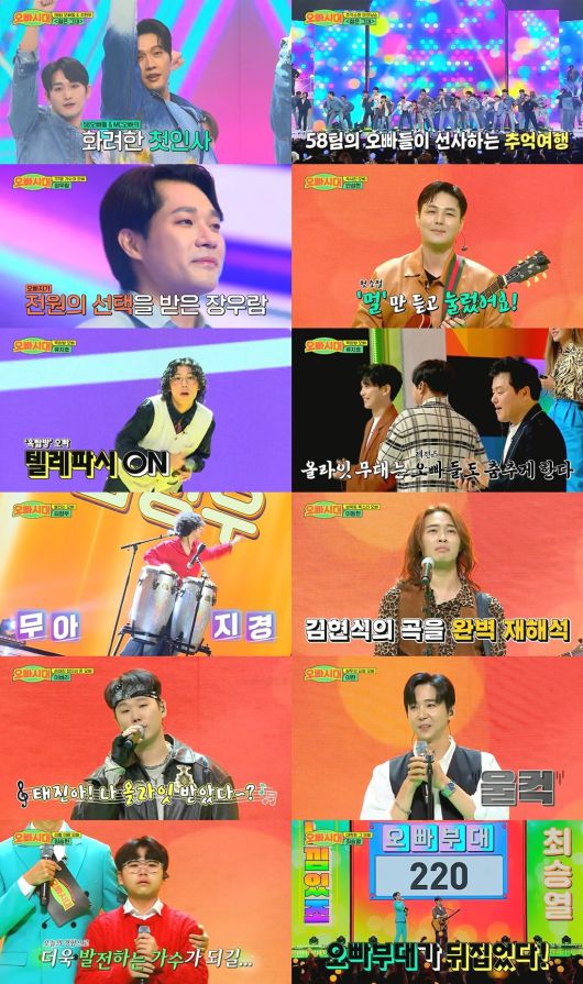이날 방송은 MC 지현우와 약 7개월간 진행된 치열한 예선을 뚫고 올라온 58팀의 오빠들이 선보이는 ‘젊은 그대’ 무대로 시작됐다. 단체로 롤러스케이트를 타고 춤과 노래를 소화하는 역대급 스케일의 오프닝 쇼가 시작부터 눈과 귀를 사로잡았다.