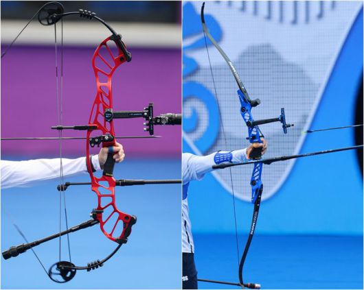 리커브와 컴파운드의 기본적인 차이는 활에 있다. 리커브가 전통적인 활이라면, 컴파운드는 도르래가 달린 기계식 활이다. 컴파운드는 2014년 인천 아시안게임부터 정식 종목으로 채택됐다.