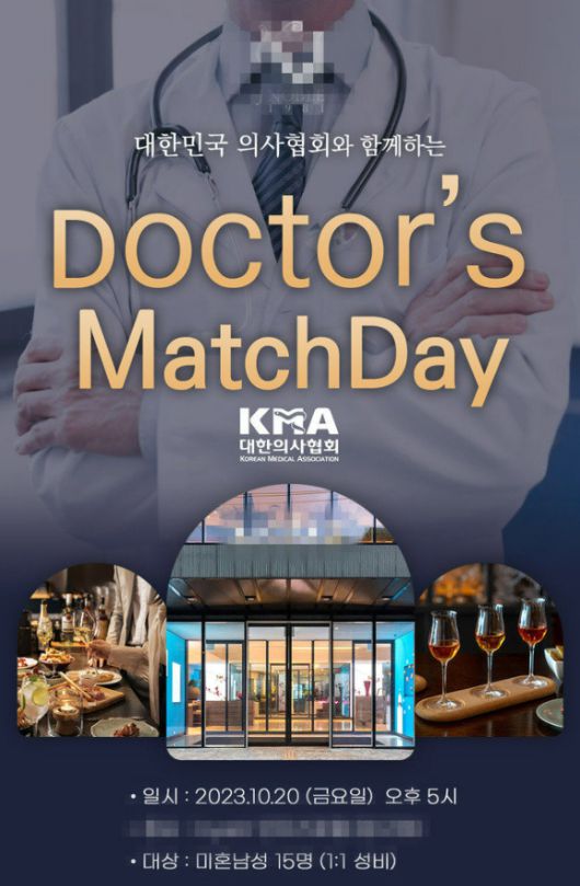 '닥터스 매치데이'라는 해당 행사 안내문에는 오는 20일 열릴 예정인 단체 맞선 행사에 참석할 45세 미만 의사 또는 치과의사인 미혼 남성 15명을 모집한다는 내용이 담겼다.
