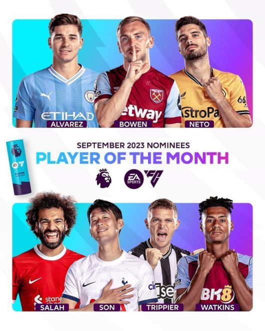 반가운 소식이 전해졌다. PL 사무국은 홈페이지를 통해 9월 이달의 선수 후보를 발표했다. 한 달 동안 PL 무대를 수놓은 선수들이 모두 포함됐다. 훌리안 알바레즈(맨시티), 제로드 보웬(웨스트햄), 페드로 네투(웨스트햄), 모하메드 살라(리버풀), 키어런 트리피어(뉴캐슬), 올리 왓킨스(빌라)와 함께 손흥민이 후보로 지명됐다.