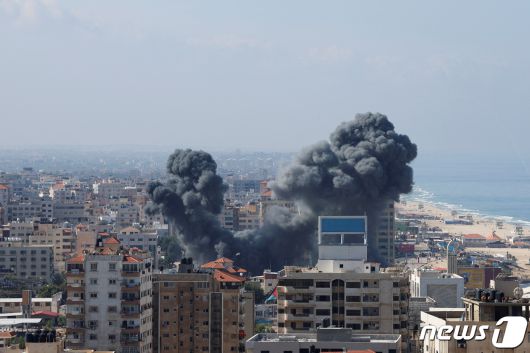 7일(현지시간) 이스라엘의 공격으로 가자지구에서 연기가 발생한 모습. 23.10.07 ⓒ 로이터=뉴스1 ⓒ News1 김예슬 기자
