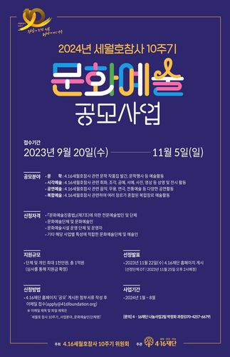 4·16재단 김광준 이사장은 "공모 선정작은 세월호참사에 대한 국민적 관심을 마련하는 매개체로 활용될 것"이라며 "작품들은 2024년 1월부터 8월까지 시민들에게 공개되니 향후 공연 및 전시 관람에 적극 참여해 달라"고 말했다.