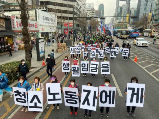 ▲지난 3월 8일 행진 중인 덕성여대 청소노동자 ⓒ민주노총 공공운수노조 서울지부 |