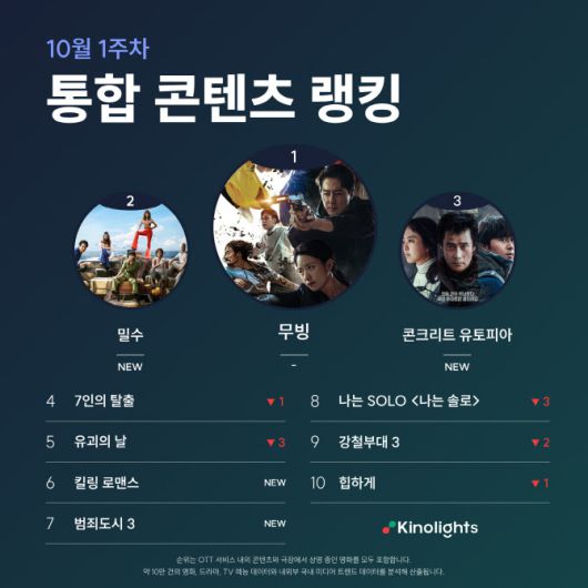 디즈니+ 오리지널 시리즈인 “무빙”이 10월 1주차에도 통합 랭킹에서 1위를 차지했다. “무빙”은 초능력을 가진 아이들과 과거의 비밀을 간직한 부모들이 함께 거대한 위험에 맞서는 초능력 액션 히어로물로, 지난 9월 20일에 마지막 화가 공개되었음에도 불구하고 여전히 시청자들의 큰 관심을 받고 있다.