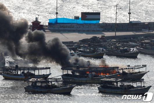 8일(현지시각) 팔레스타인 무장정파 하마스의 기습 공격에 대한 이스라엘 군의 보복 공격을 받은 가자항의 보트에서 연기가 솟아 오르고 있다. 2023.10.9 ⓒ 로이터=뉴스1 ⓒ News1 우동명 기자 |