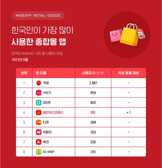 지난 8월 한국인이 가장 많이 사용한 종합몰 앱 순위는 쿠팡, 11번가, G마켓, 알리익스프레스, 티몬, 위메프, 옥션, GSSHOP 순이었다.
