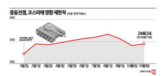 미국발 고금리와 달러 강세, 유가 등으로 9월부터 조정이 이어지고 있는 국내 증시는 중동 지정학적 리스크로 바닥 확인이 지연될 가능성도 배제할 수 없을 것으로 보인다. 양해정 DS투자증권 연구원은 "단기적으로 안전자산 선호가 나타날 수 있어 달러 강세가 이어지면서 시장의 바닥 확인이 지연될 수도 있다"고 설명했다.