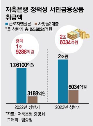 근로자햇살론과 함께 SGI서울보증이 100% 보증하는 사잇돌2대출 취급액(6034억원)을 합치면 저축은행 창구에서 풀린 서민대출은 상반기 2조6034억원이었다. 1인당 대출액은 비공개지만 1000만원으로 잡아도 20만명 전후가 이용한 것으로 추정된다.