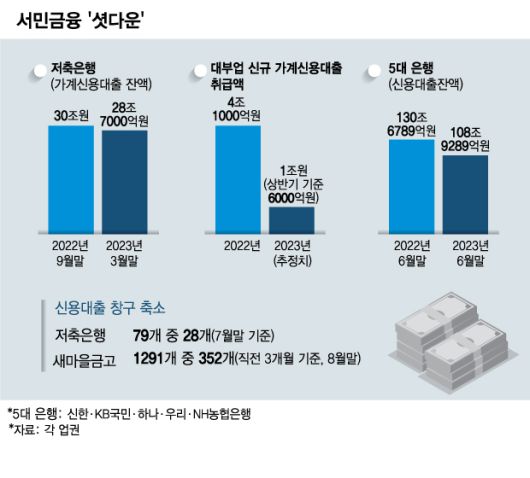 10일 금융권에 따르면 신용점수 하위 20%(신용점수 600점 이하, 신용등급 9·10등급) 서민들의 제도권 진입 문턱이 높아져 불법사금융 절벽에 내몰릴 위기에 처했다. 저축은행 가계신용대출 잔액이 6개월 새 1조원 줄었고, 대부업체의 대출 취급액도 전년 대비 3조원 급감할 것으로 추정된다. 5대 은행의 신용대출 잔액마저 최근 1년 22조원 급감했다. 고금리 장기화로 조달금리가 2배 상승했지만 최고금리가 20%로 묶여 이익을 못 내는데다 연체율까지 올라가 금융회사가 자체 상품 판매를 축소한 결과다.