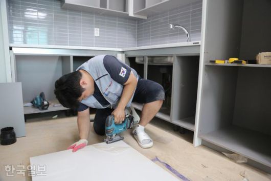 지난달 22일 오후 서울 성북구의 한 아파트 인테리어 공사 현장에서 장남연(25) 한샘서비스 사수가 주방 선반을 조립하고 있다. 한샘 제공 |