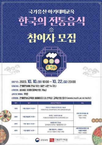 [이데일리 이윤정 기자] 문화재청 한국전통문화대학교 전통문화교육원은 오는 10월 25일부터 11월 4일까지 총 4회에 걸쳐 2023년 ‘국가유산 아카데미교육-한국의 전통음식’ 교육을 운영한다.