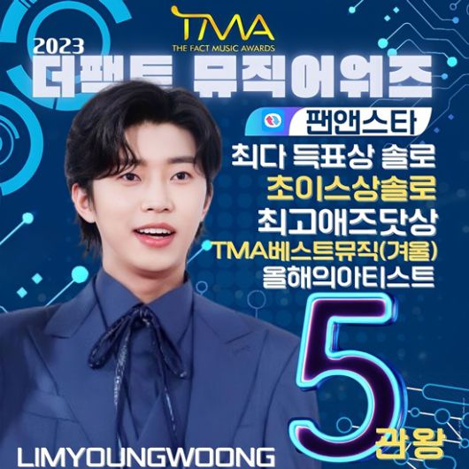 10일 오후 6시 30분 인천 남동체육관에서 열린 이날 시상식에서 임영웅은 팬앤스타 최다 득표상 솔로, 팬앤스타 초이스상 솔로, 팬앤스타 최고 애즈닷상, 올해의 아티스트상, TMA 베스트 뮤직(겨울)의 주인공이 됐다.